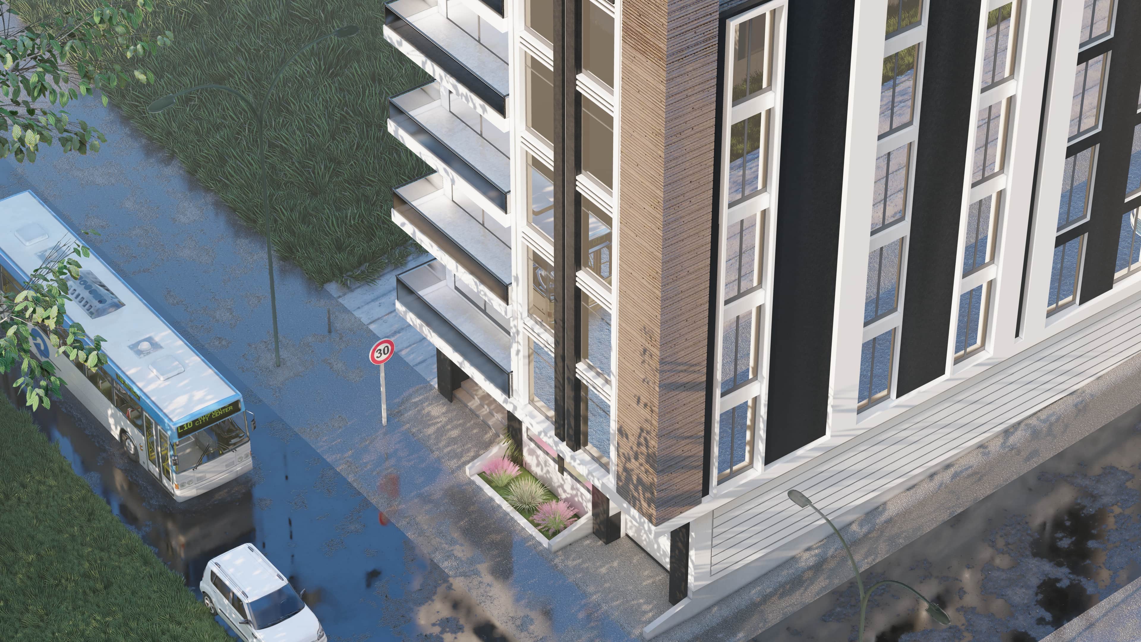 Objekat sadrži 12 stanova, odnosno 2 stana po etaži. Nalazi se na parceli koja je na uglu dve ulice koje su na različitim nivoima terena.